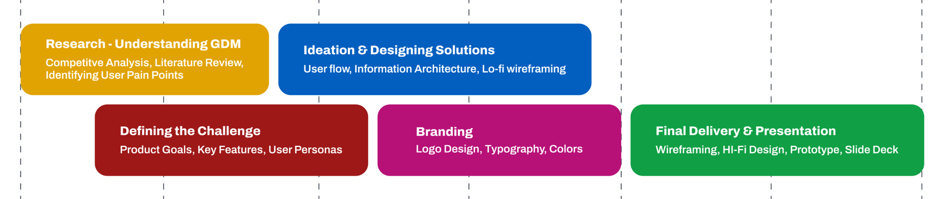 With such a tight deadline of 48 hours, I jumped in and mapped out a game plan to keep things moving and organized. I streamlined the design process by overlapping tasks to save time—like combining research with defining the challenge and product goals, and pairing ideation with branding. Tasks were assigned according to each team member's strengths, and I encouraged the team to experiment and step outside their comfort zones.